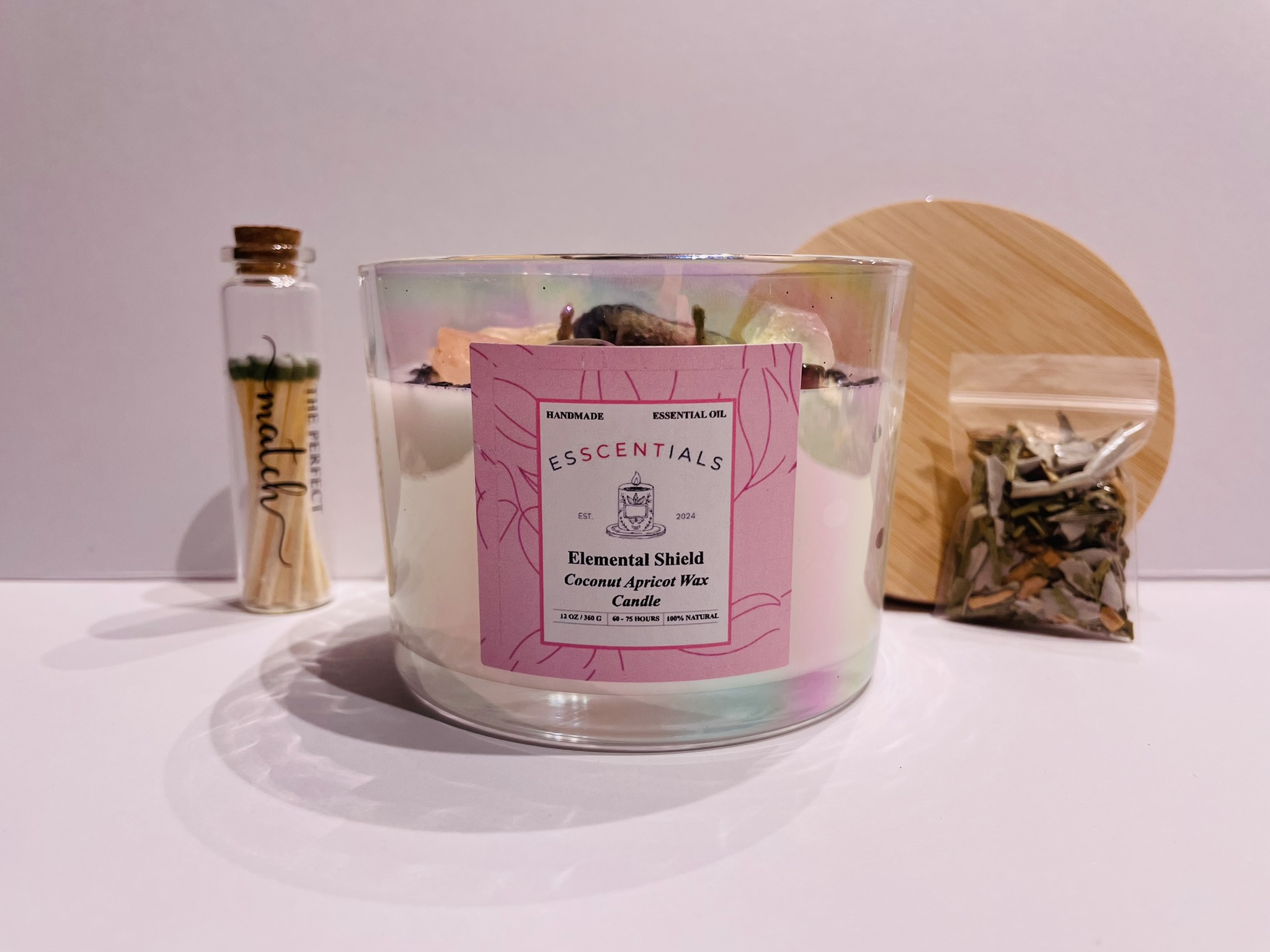 Infused with powerful protection and grounding energy, the ELEMENTAL SHIELD candle is designed to instill courage, resilience, and strength. This 12 oz glass jar holds a potent blend of crystals and black salt, enhanced by a handcrafted Sacred 4 Blend smudging kit for cleansing, burning, and energy purification.
