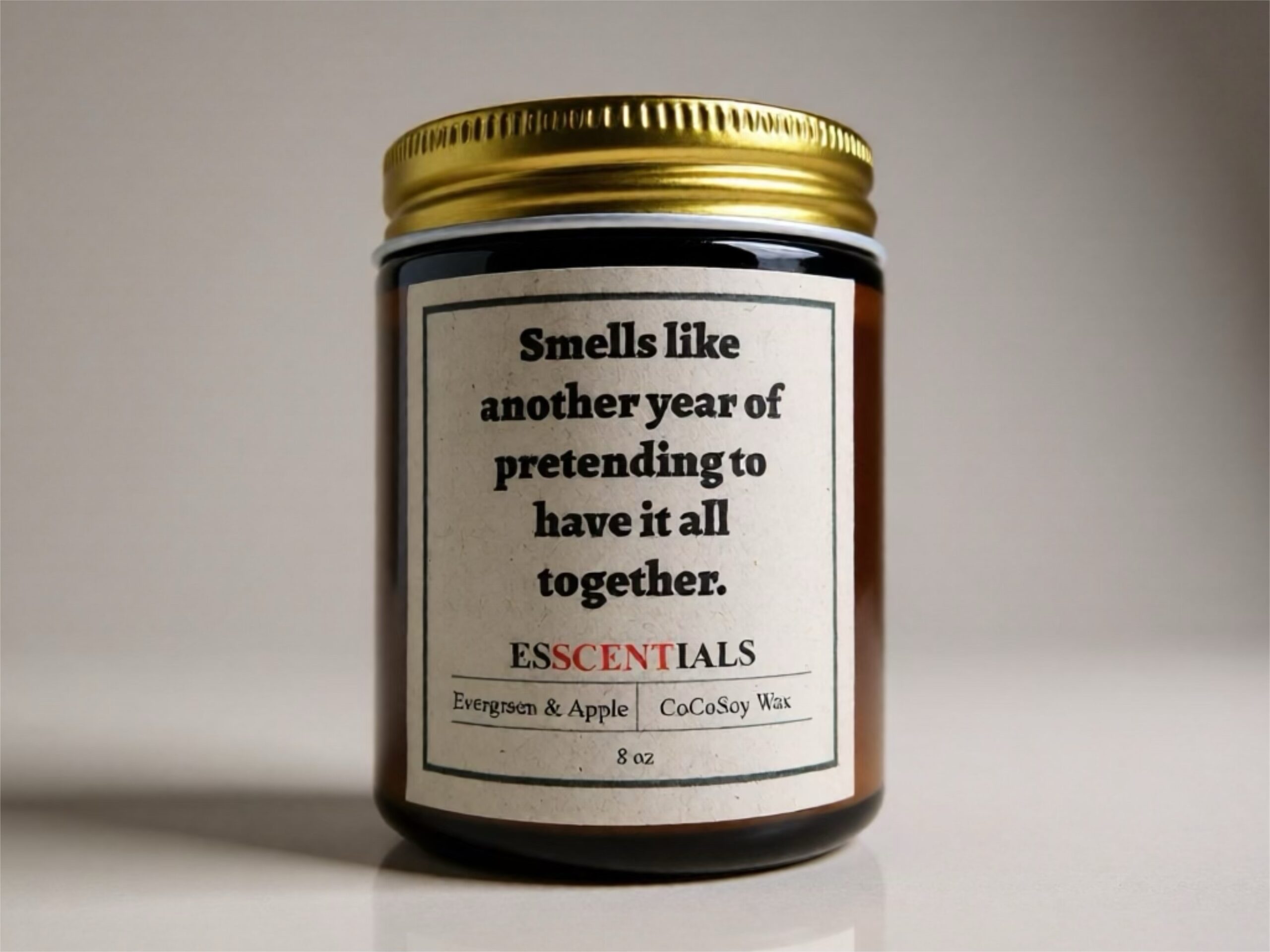 A little humor, a little honesty, and a lot of fragrance. Our Evergreen & Apple Humor Candle is hand-poured with a smooth CocoSoy blend and designed in a chic amber glass jar. Fresh evergreen needles mingle with crisp apple notes to create a scent that’s equal parts refreshing and cozy. This playful candle comes with a witty label—because sometimes the best way to get through another year of “pretending to have it all together” is with a laugh and a great-smelling room. Perfect for gifting, mood-lifting, or simply burning while you embrace life’s imperfections.