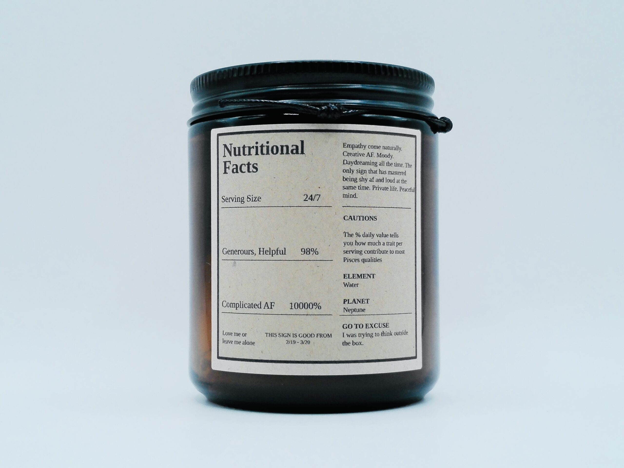 This candle includes reference to Nutritional Facts for Pisces representing imagination, emotional sensitivity, romantic chaos, dream state loyalty, and artistic delusions.