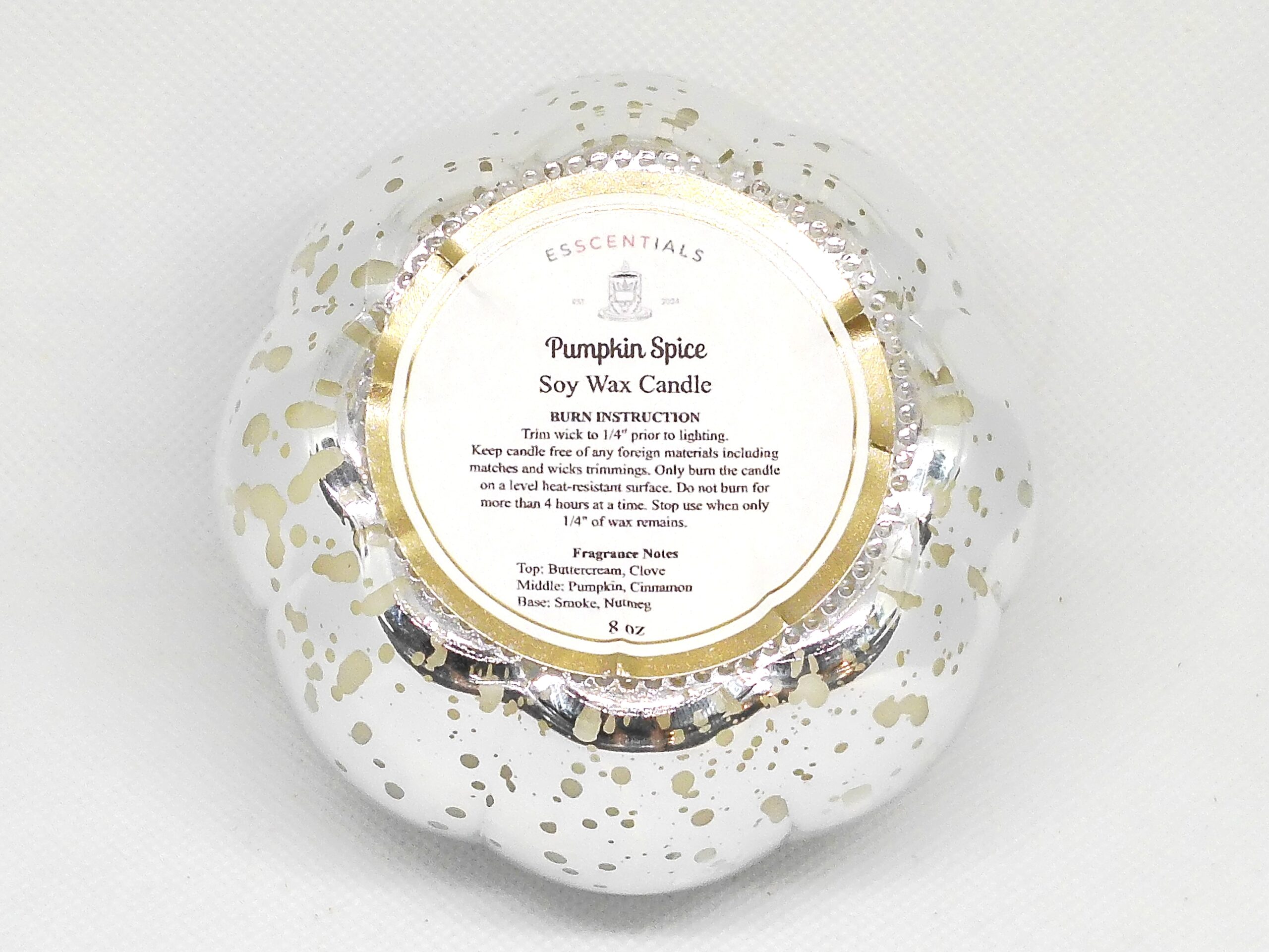 From our Fall Collection, the Pumpkin Spice Candle in a stunning 8 oz Mercury Glass Pumpkin-Shaped Vessel is the ultimate autumn indulgence. It opens with the rich creaminess of Buttercream and the warm spice of Clove, melts into a heart of Cinnamon and Pumpkin, and finishes with a cozy blend of Smoke and Nutmeg. The shimmering mercury glass design adds a touch of seasonal elegance, perfect for creating a warm and inviting atmosphere in your home or gifting to someone special.