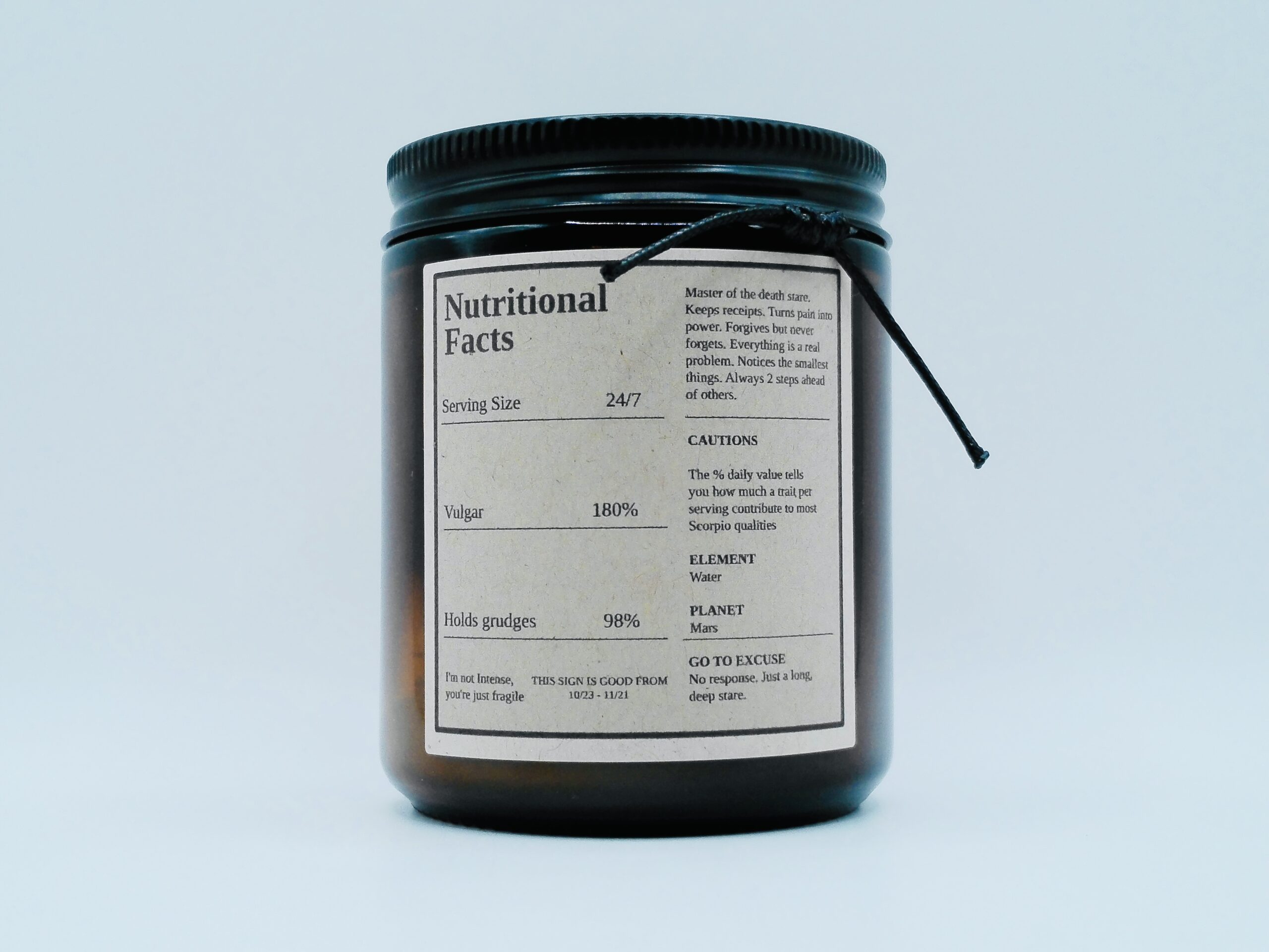 This candle includes reference to Nutritional Facts for Scorpio reflecting intensity, revenge archives memory bank, loyalty to the chosen few, emotional x-ray vision, and silent power.