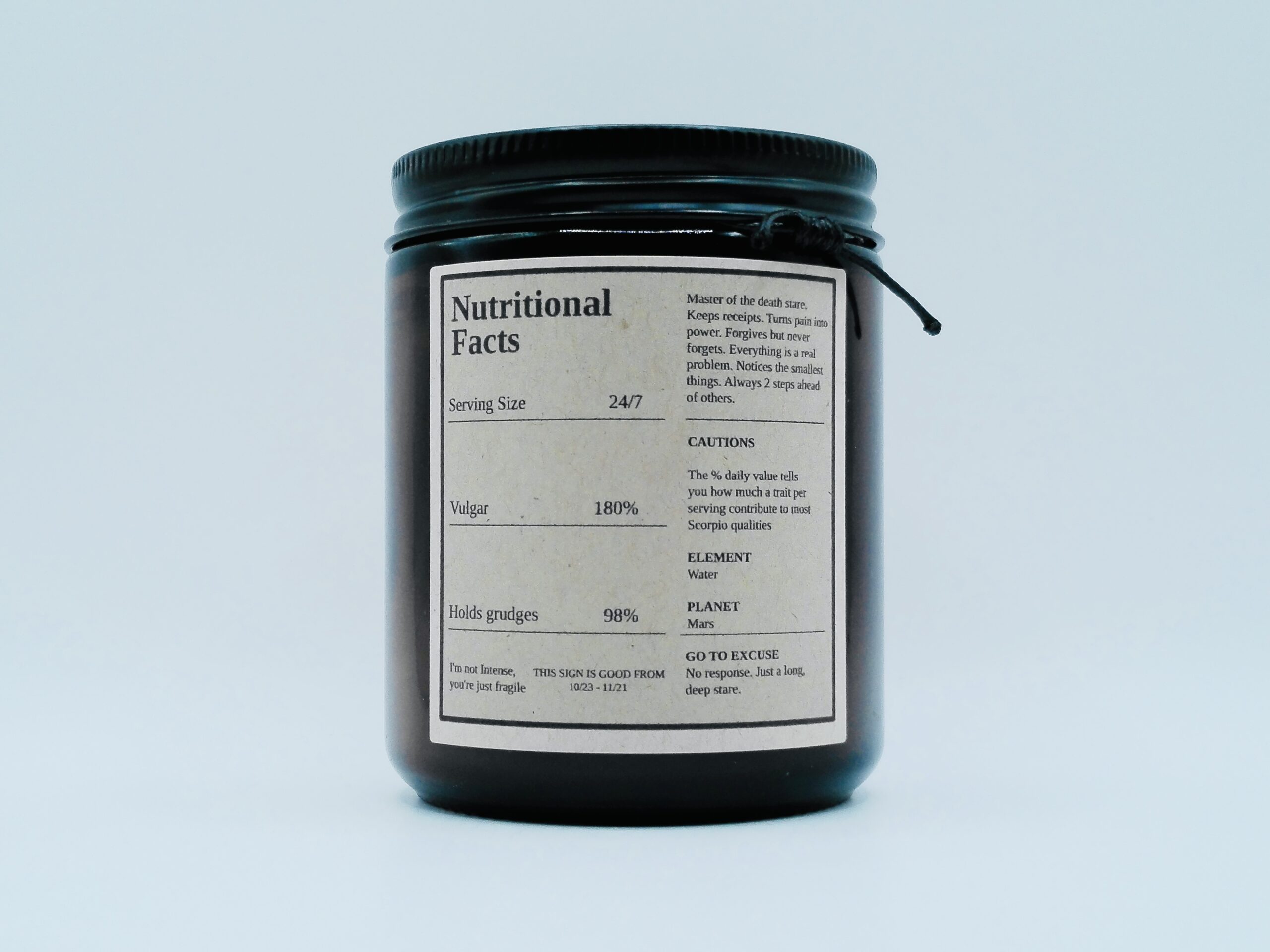 This candle includes reference to Nutritional Facts for Scorpio symbolizing emotional x-ray vision, secret agenda power, loyalty, silence & unmatched intensity.