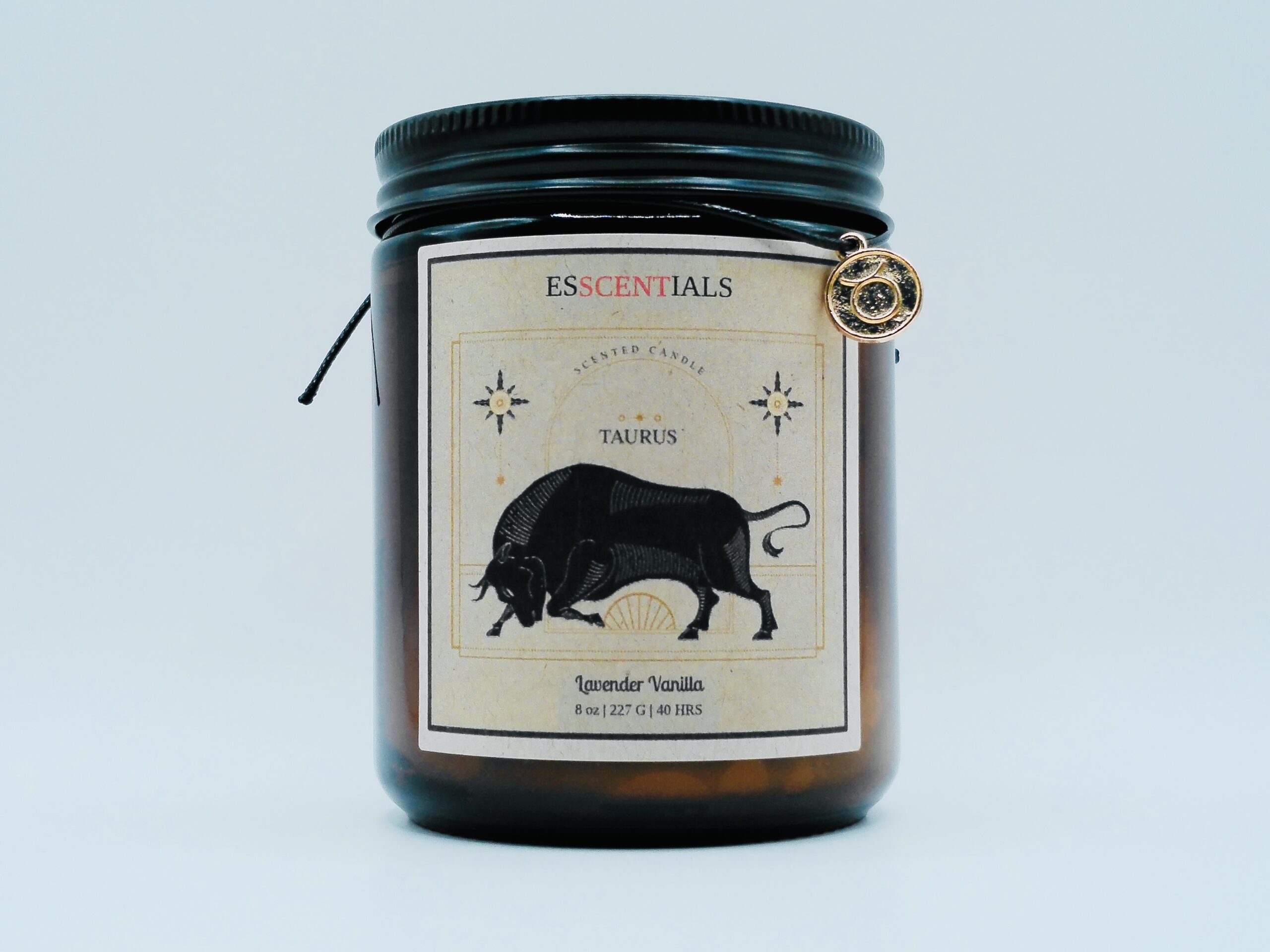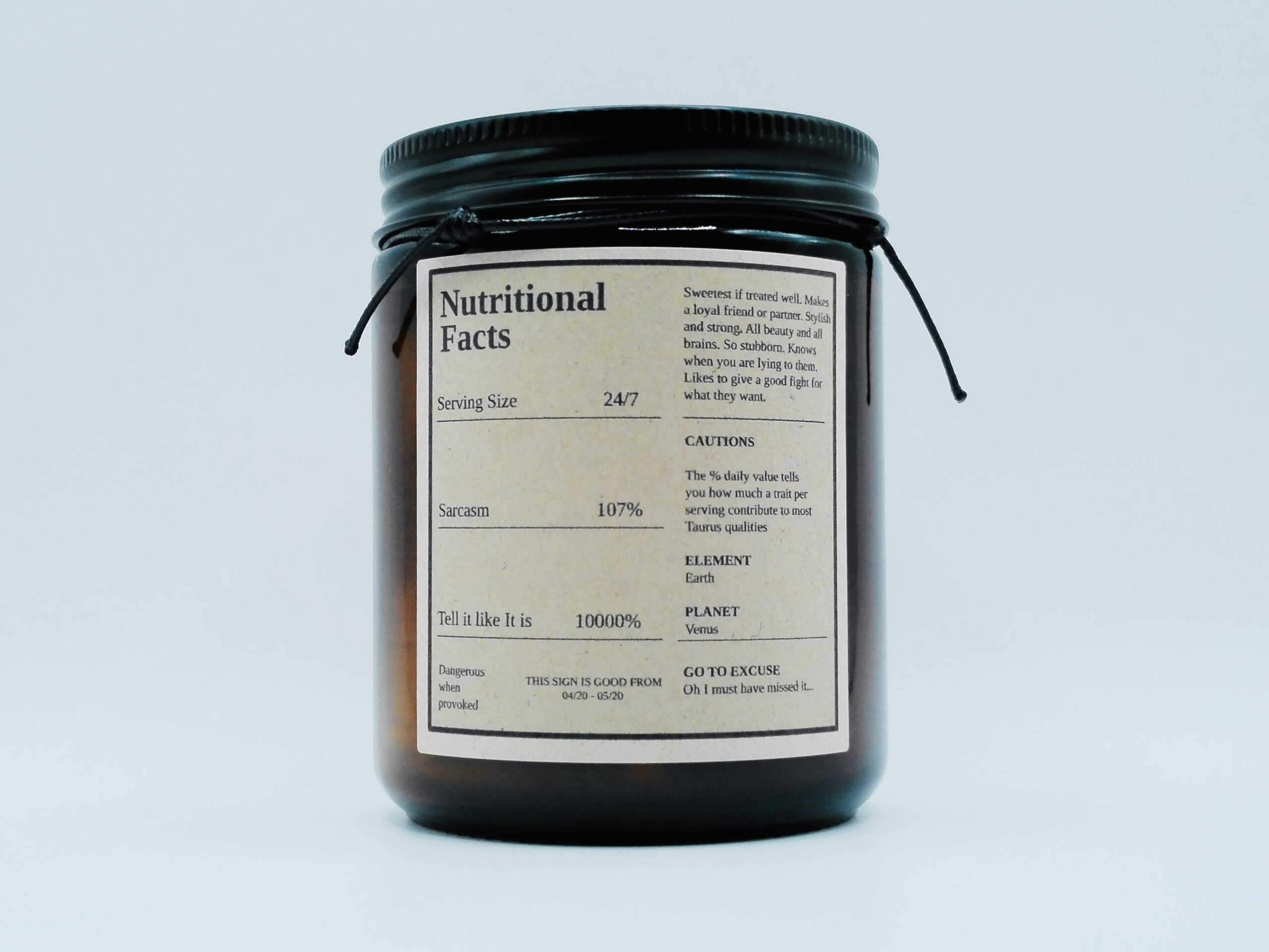 This candle references Nutritional Facts for Taurus representing stubborn determination, comfort obsession, food cravings, sensual luxury, and loyalty that lasts forever.