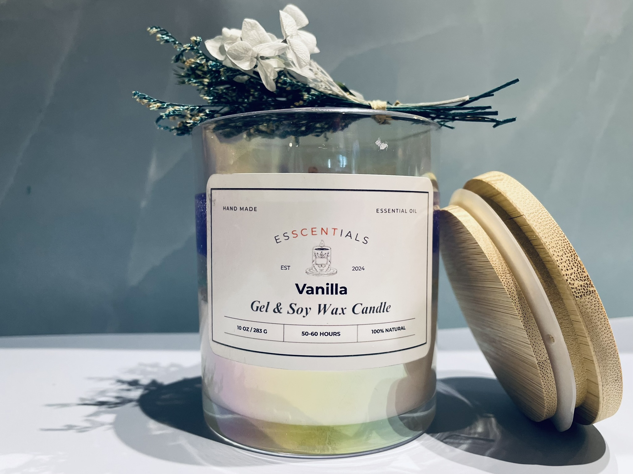 Vanilla with gel and soy wax combines the warm, comforting scent of vanilla with the clear, jelly-like texture of gel wax and the smooth, eco-friendly burn of soy wax. This blend offers a cozy and inviting fragrance with a visually appealing presentation.