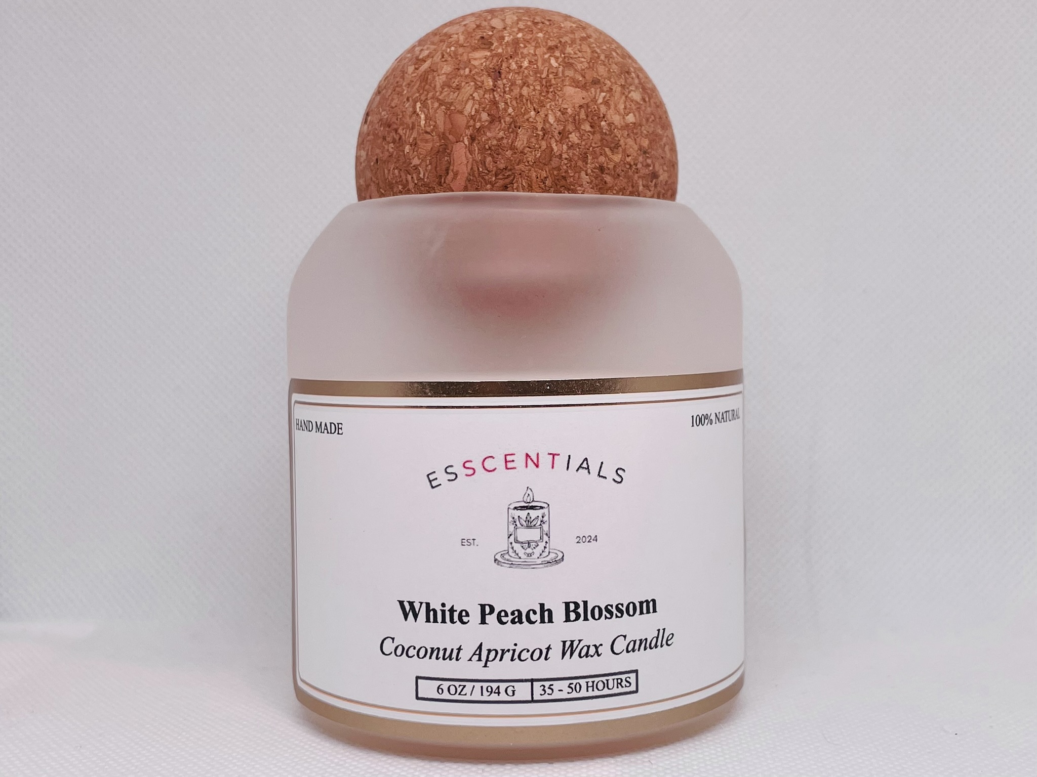 Hand-poured in a beautifully frosted glass vessel with a natural cork top, this 6 oz candle is made with a clean-burning Coconut Apricot Wax blend. The scent opens with juicy white peach, gently blended with notes of blossoming jasmine, citrus zest, and a touch of vanilla musk. This soft, elegant fragrance brings a fresh and airy feel to any space, perfect for relaxation or setting a light, floral mood.