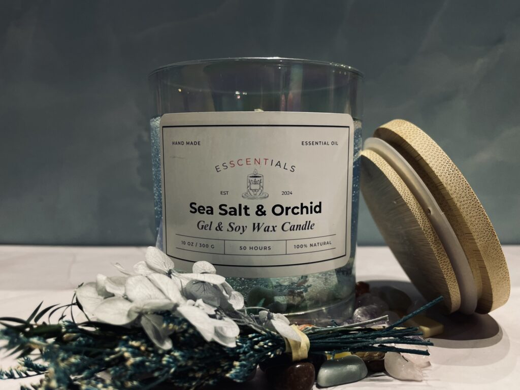 Immerse yourself in the serene fragrance of the Sea Salt and Orchid scented candle, crafted with a luxurious blend of Gel wax and soy wax. This candle combines the invigorating scent of Sea Salt with the delicate, floral notes of Orchids, creating a tranquil and refreshing ambiance.
